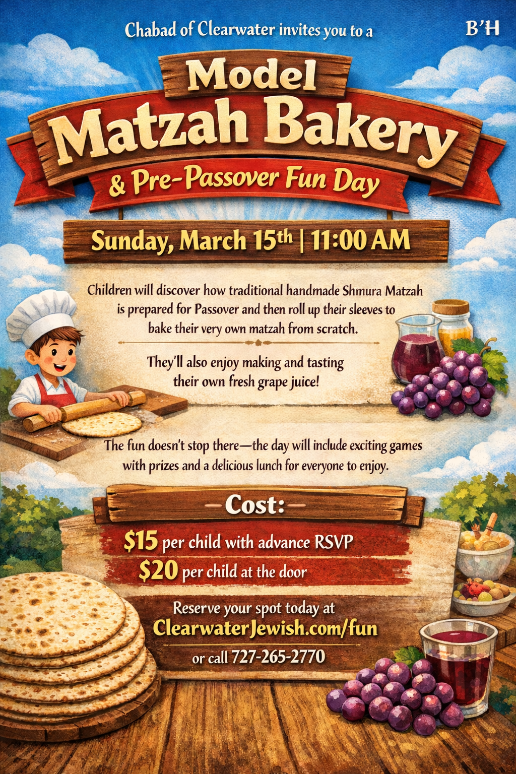 Chabad of Clearwater invites you to a Model Matzah Bakery and Pre-Passover Fun Day on Sunday, March 15th at 11:00 AM!