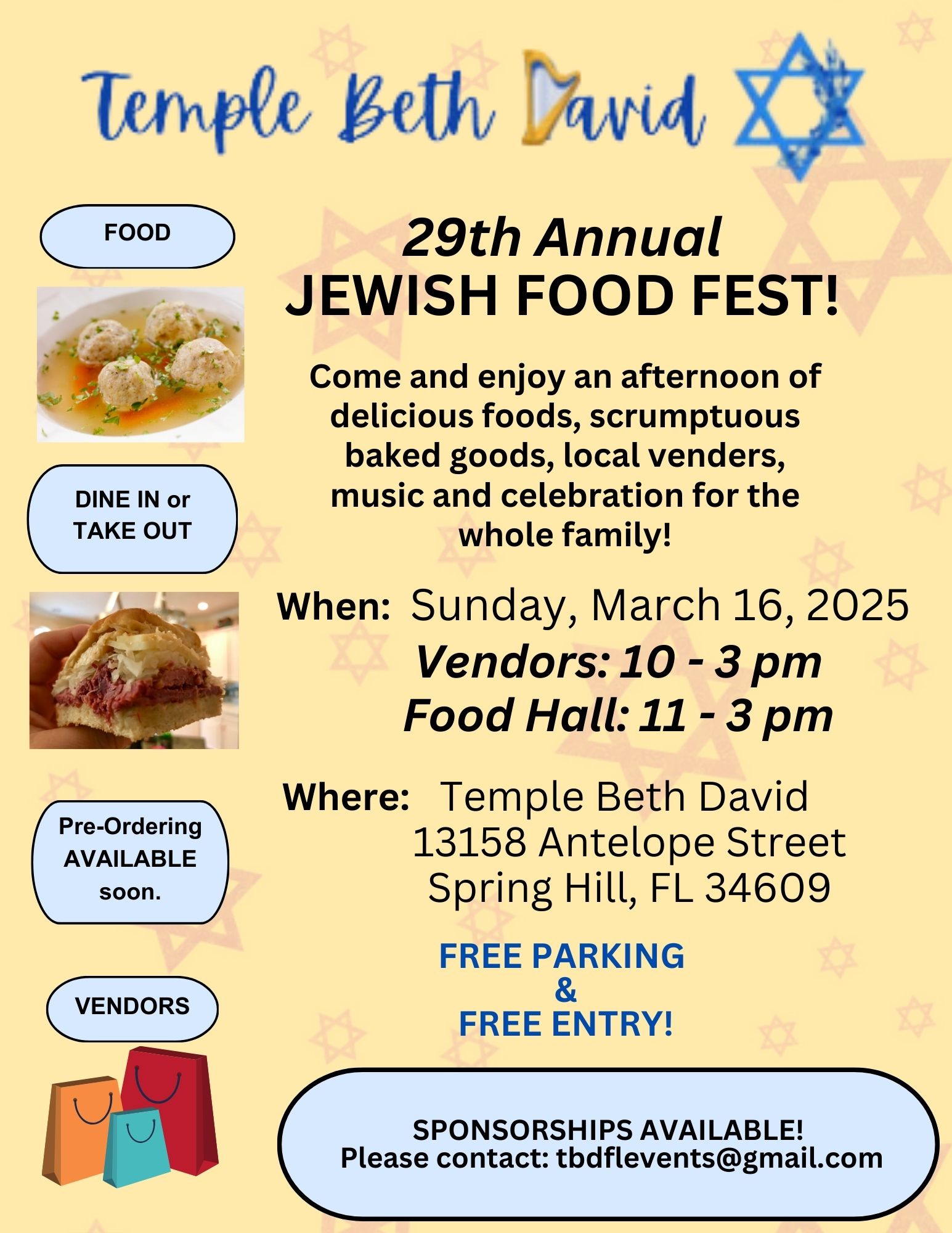 Join us for our 29th annual Food Fest! Jewish foods and baked goods available for purchase (pre-ordering available online soon).