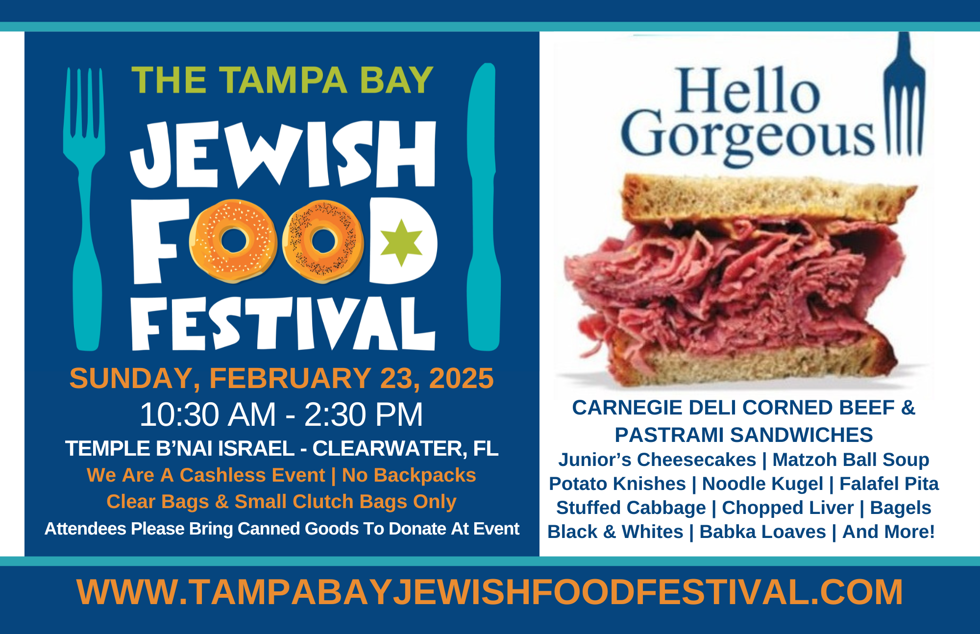 Temple B’nai Israel Presents the 2025 Tampa Bay Jewish Food Festival. We are back to having an in-person full event this year, with plenty of your favorite Jewish foods, including Carnegie Deli Corned Beef & Pastrami Sandwiches, Junior’s Cheesecakes, Noodle Kugel, Stuffed Cabbage, Chopped Liver, Matzoh Ball Soup, Black & White Cookies, Hamantaschen, Rugelach, and much, much more.
