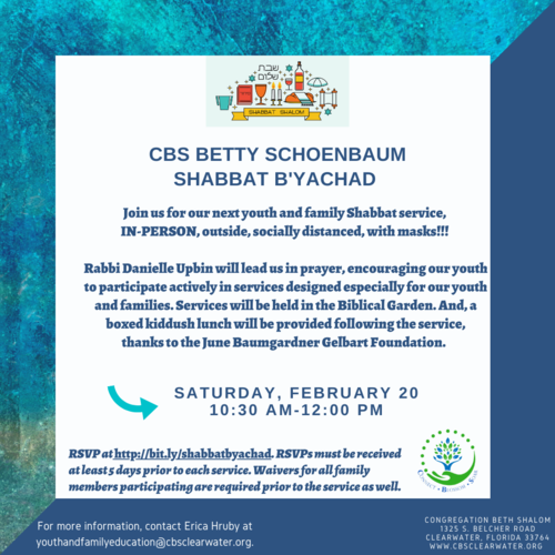 Youth and families! Please join us for our monthly Betty Schoenbaum Shabbat B'Yachad. Rabbi Danielle Upbin will lead us in prayer, encouraging our youth to participate actively in services designed especially for our youth and families. A kiddush lunch will be provided to all participants, thanks to the June Baumgardner Gelbart Foundation.