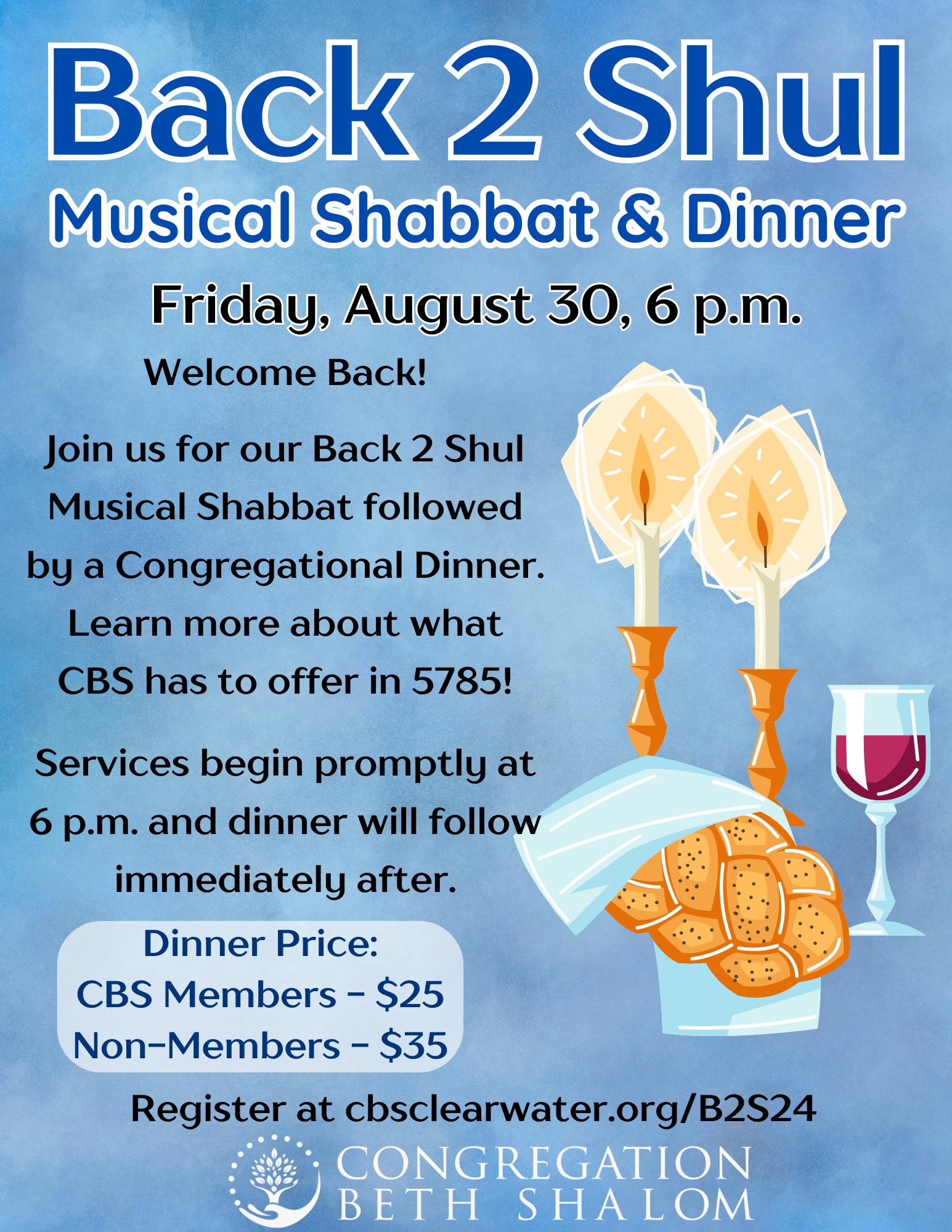 This Back 2 Shul night we will be bringing in the Sabbath with music, community and a delicious catered shabbat dinner. This event is open to the whole community. CBS member dinner cost is $25, and the non-member price is $35. We are excited to show you what CBS is all about!