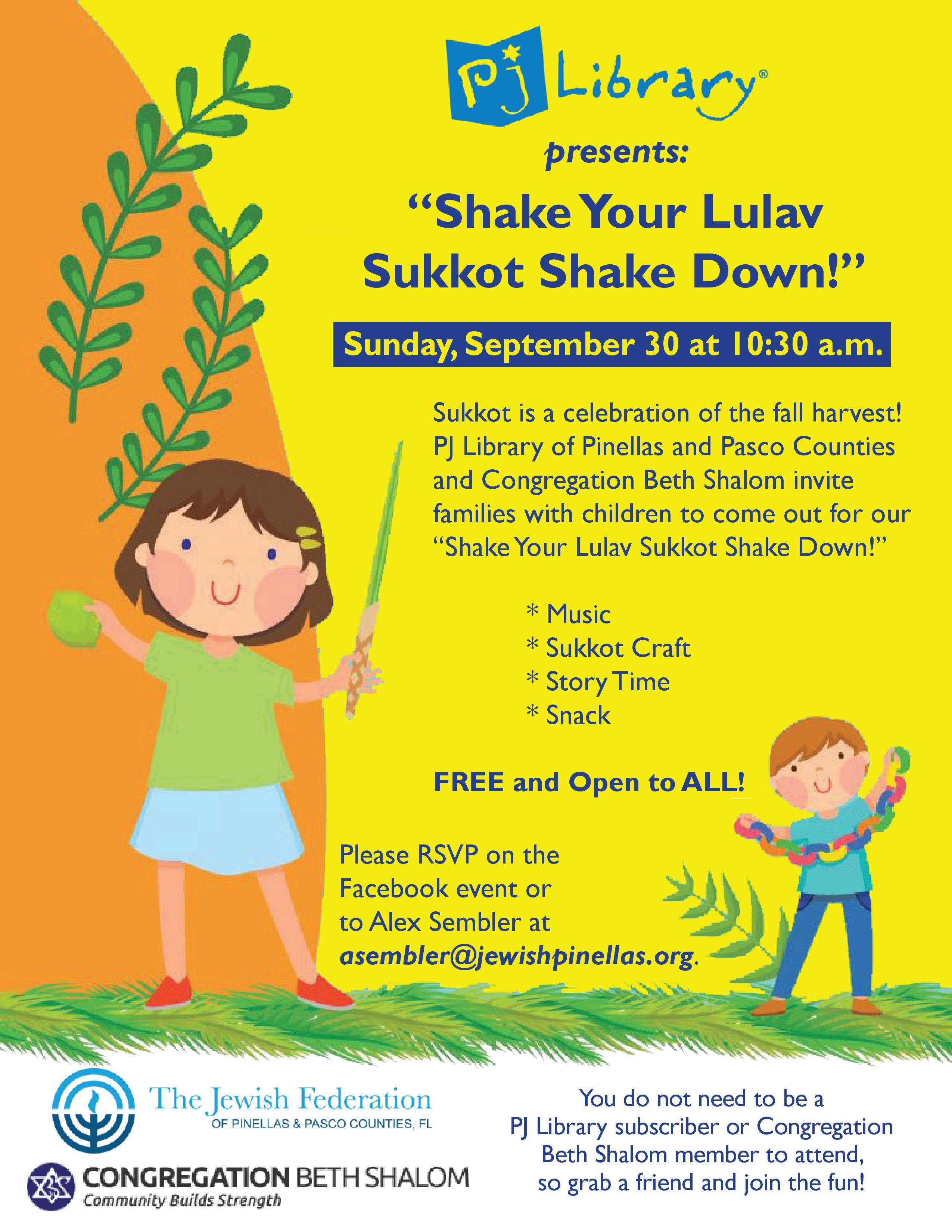 Sukkot is a celebration of the fall harvest! PJ Library of Pinellas and Pasco Counties Florida and Congregation Beth Shalom invite families with children under 8 and younger to "Shake Your Lulav Sukkot Shake Down" Sunday, September 30th at 10:30 am.