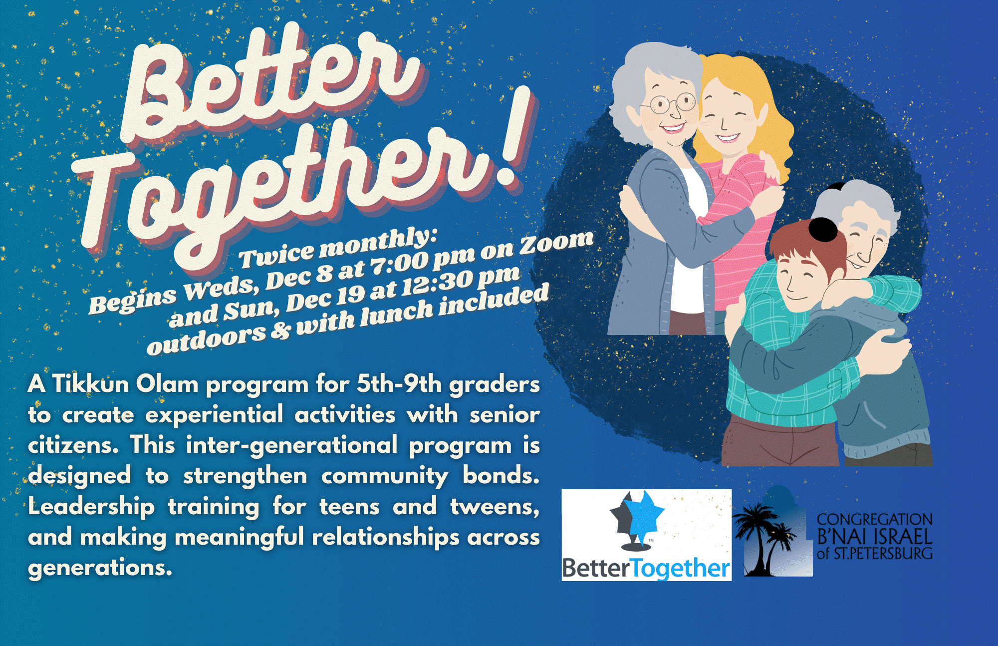 5th-9th grade group designed for Tikkun Olam. Our specific goal is outreach to the Jewish senior citizen community to build relationships and strengthen community bonds. This program includes leadership training for tweens and teens.