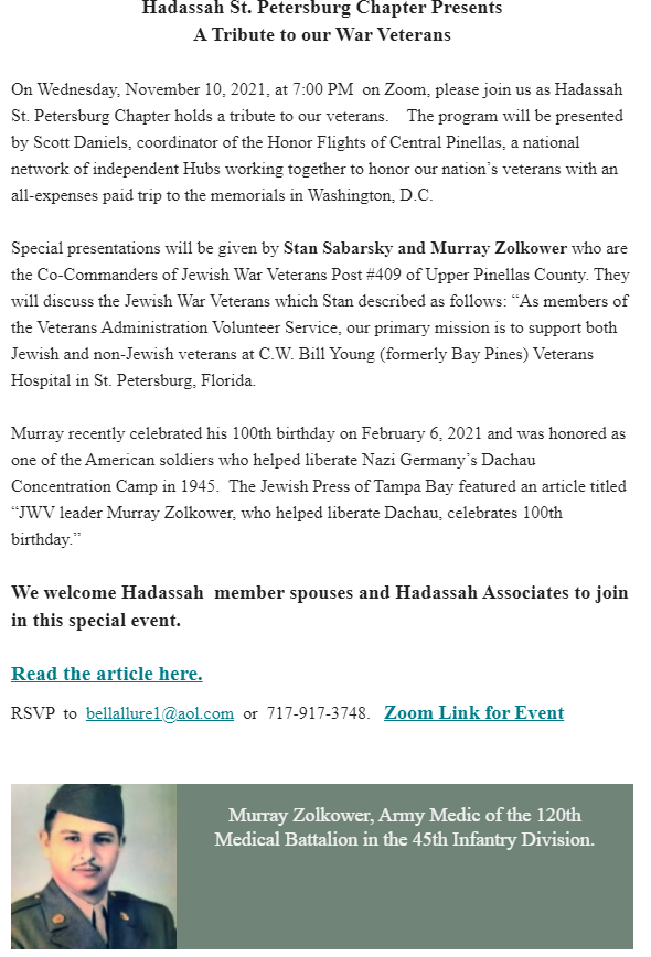 Read the article: https://www.jewishpresstampa.com/articles/jwv-leader-murray-zolkower-who-helped-liberate-dachau-celebrates-100th-birthday/ Join the Zoom Meeting: https://hadassah-org.zoom.us/j/81248378406?pwd=UVFnazhoTkRqNzR2NGNzdnYxMVh0UT09#success