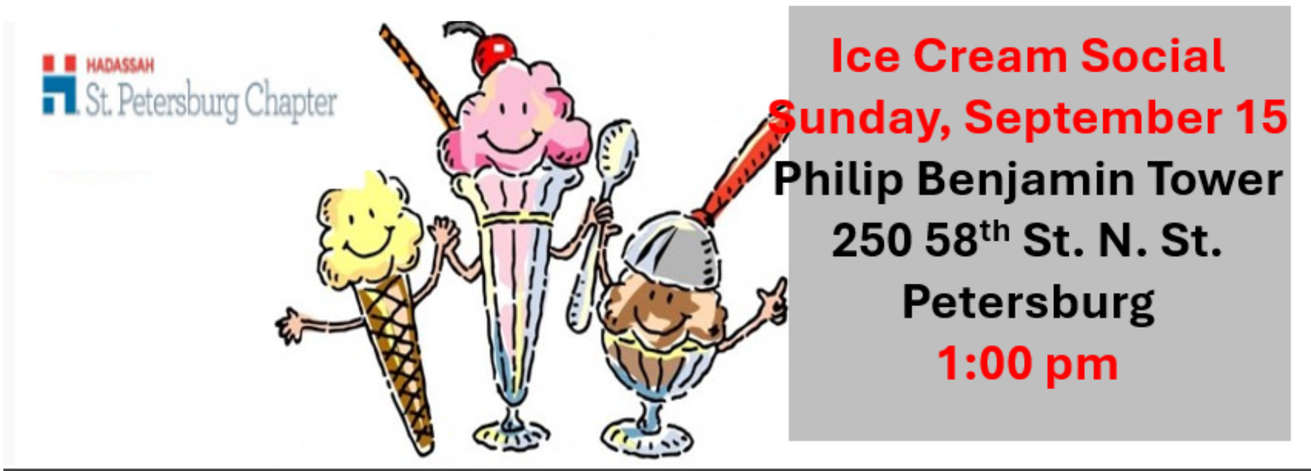 For anyone who loves ice cream and wants to shmooze with old and new friends – come to Hadassah St. Petersburg’s Ice Cream Social on September 15, 2023, at 1:00 PM at Philip Benjamin Tower, 250 58th Street N. St. Petersburg Florida,
