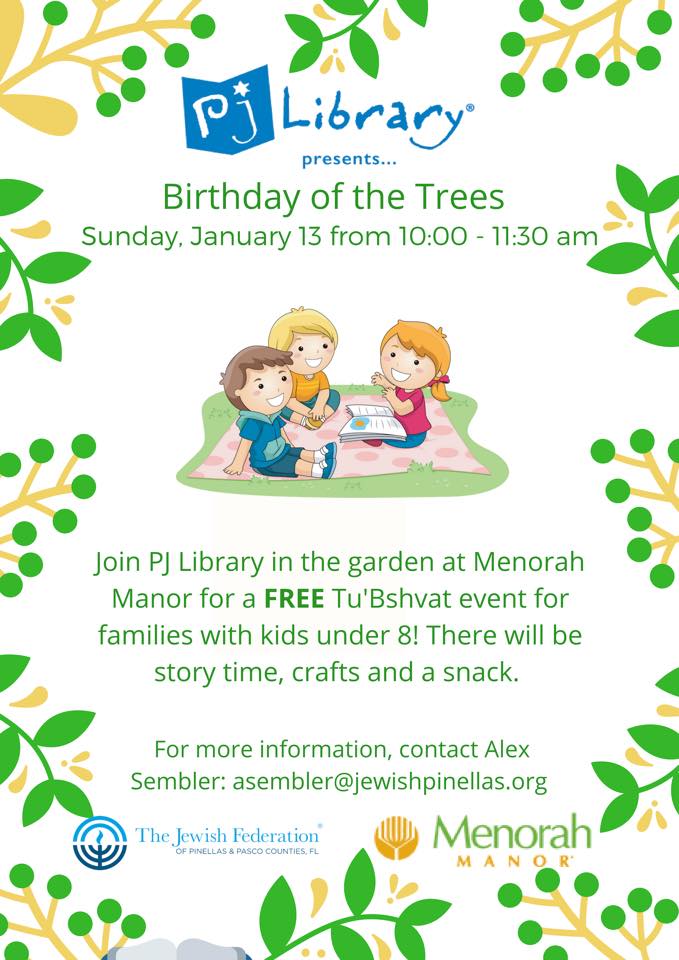 Join PJ Library of Pinellas and Pasco Counties Florida to celebrate the birthday of the trees, Tu'Bshvat, with a PJ Library story, snack, and craft in the garden at Menorah Manor! This event is free and open to families with children under 8. For more information, please contact asembler@jewishpinellas.org