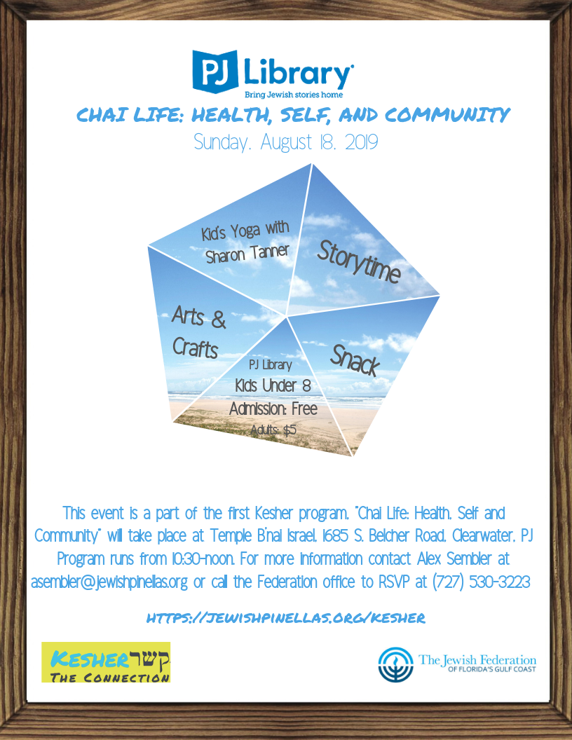 This event is a part of the first Kesher program, "Chai Life: Health, Self and Community" will take place at Temple B’nai Israel, 1685 S. Belcher Road, Clearwater, PJ Program runs from 10:30-noon. For more information contact Alex Sembler at asembler@jewishpinellas.org or call the Federation office to RSVP at (727) 530-3223