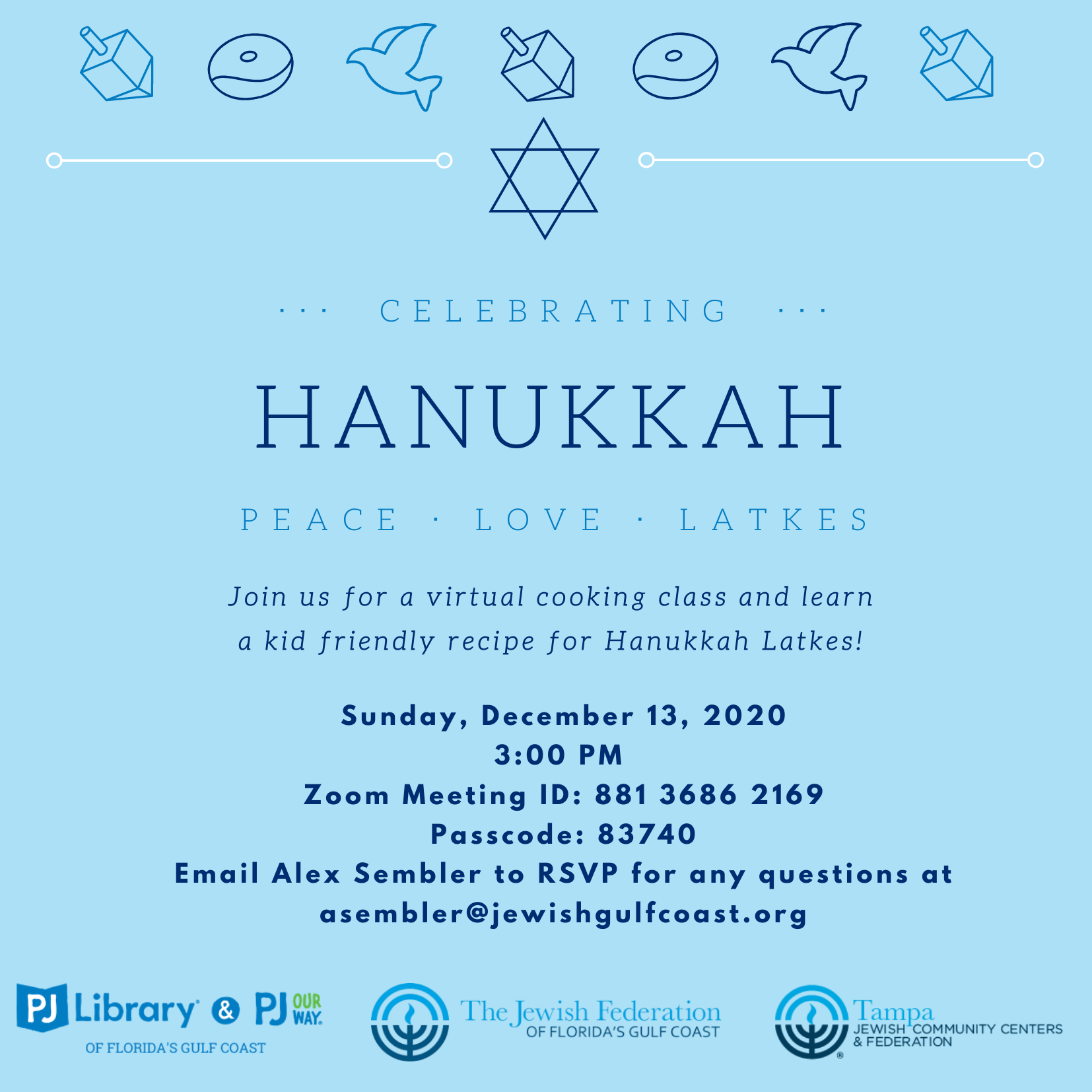 Join us for a virtual cooking class and learn a kid friendly recipe for Hanukkah Latkes! Please email Alex Sembler with any questions at asembler@jewishgulfcoast.org