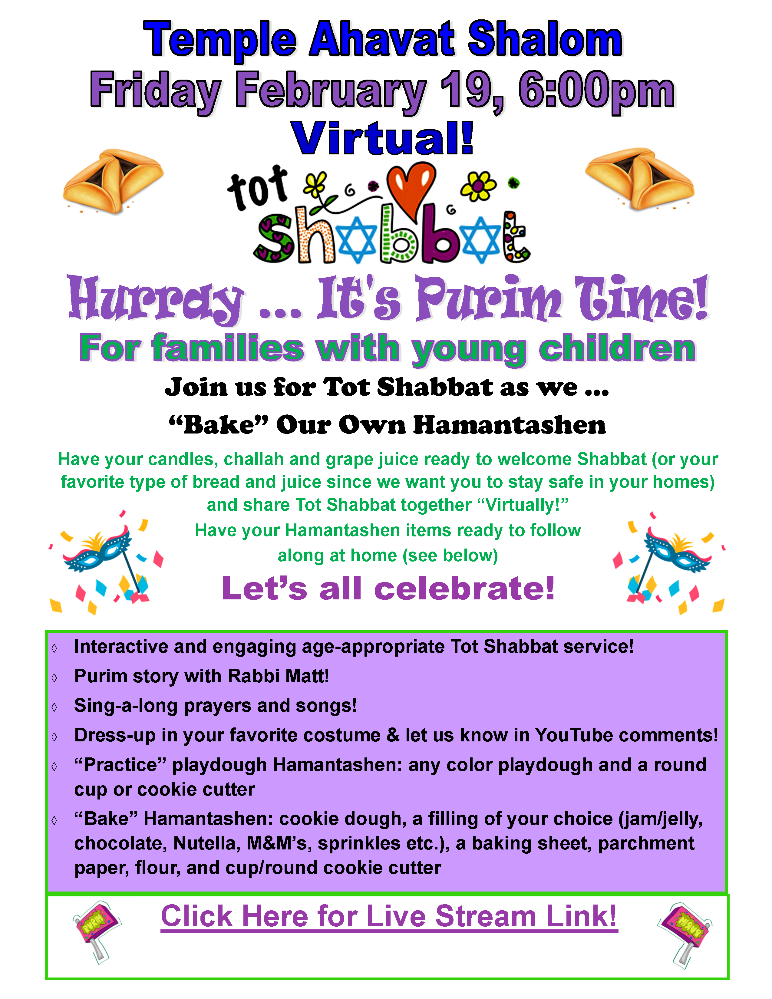 Have your candles, challah and grape juice ready to welcome Shabbat (or your favorite type of bread and juice since we want you to stay safe in your homes) and share Tot Shabbat together “Virtually!”