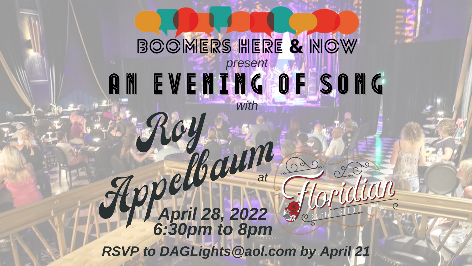 Calling all Boomers & their buds! Let’s get together at the Floridian Social Club on Thursday, April 28 to enjoy an evening of song with Roy Appelbaum, a unique singer with a fabulous voice! From 6:30pm to 8pm we encourage all Boomers from the St. Pete and surrounding areas to bring a friend (or a few!) for live music from Roy and also Steve Miller and stay for more live music starting at 8pm. This space is large so the more the merrier!