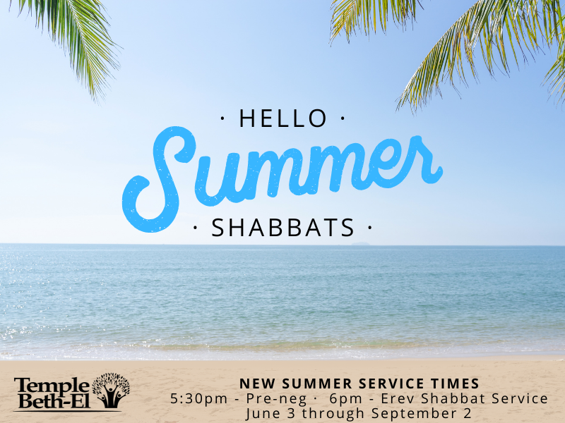 From June 3 through September 1, Erev Shabbat Services will begin a little earlier so you can spend the longer evenings with your families! Let’s connect at 5:30pm over a pre-service reception then head into service at 6pm. Enjoy Summer Shabbats with your TBE family!