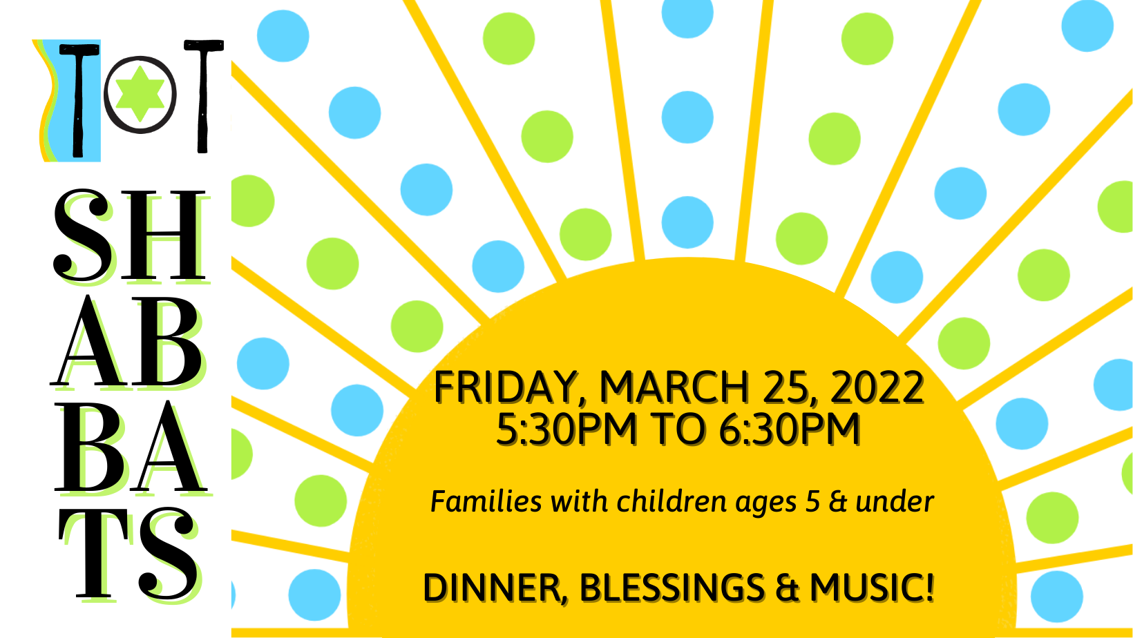 It's time for Tot Shabbat! Please join Rabbi Mangold, our Director of Early Childcare, Randi Nash-Ortiz, and your TBE friends for dinner, blessings and joyful Shabbat music! No registration is needed for this event and it will be outdoors.